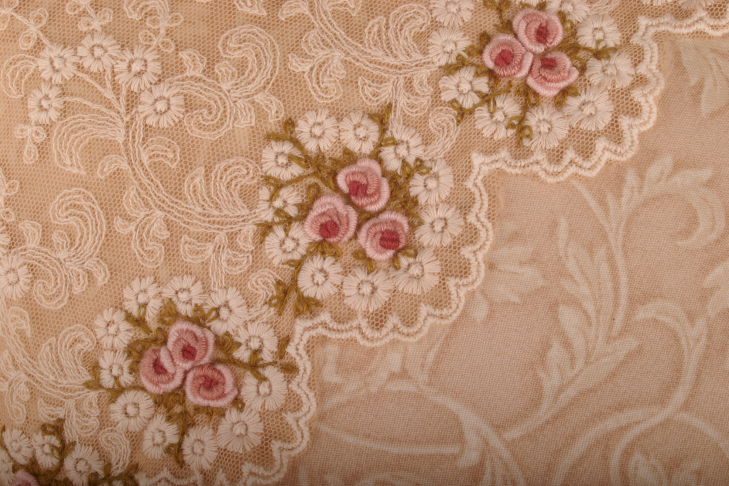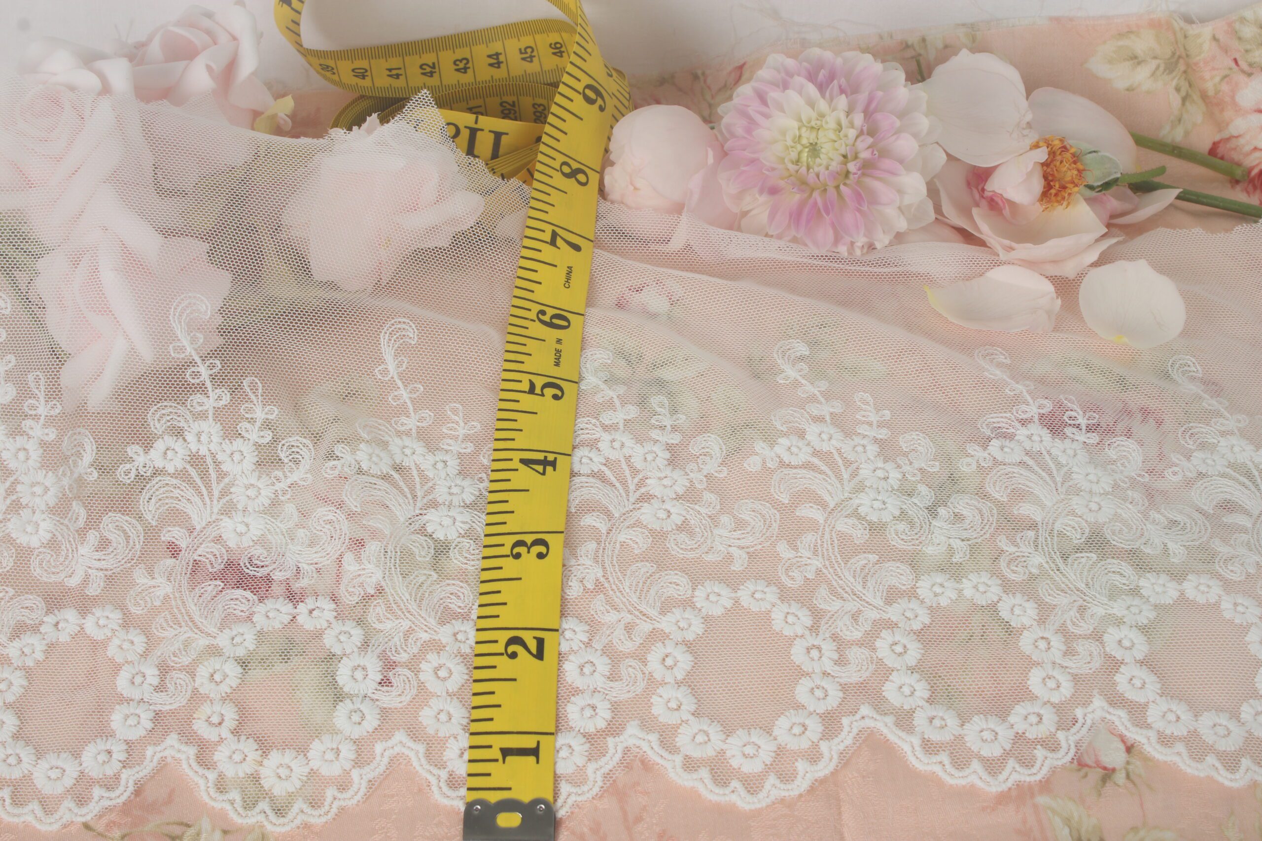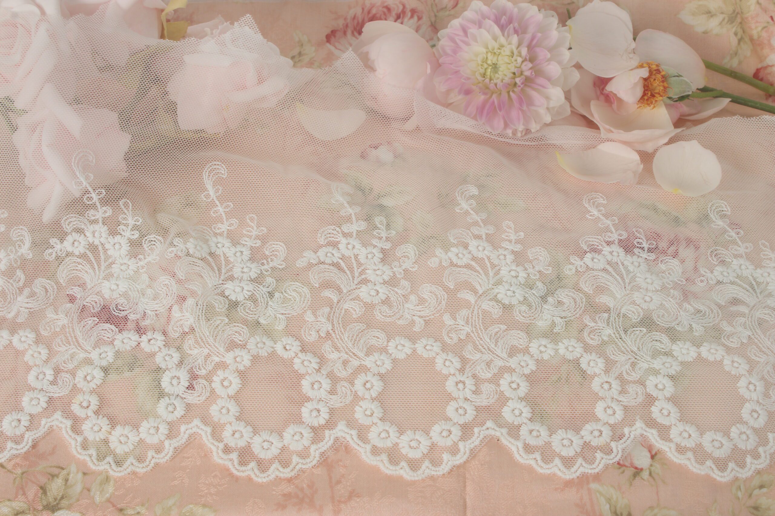 Exquisite white Cotton Lace, tulle with embroidered scalloped edging. Vintage style 8″ wide.