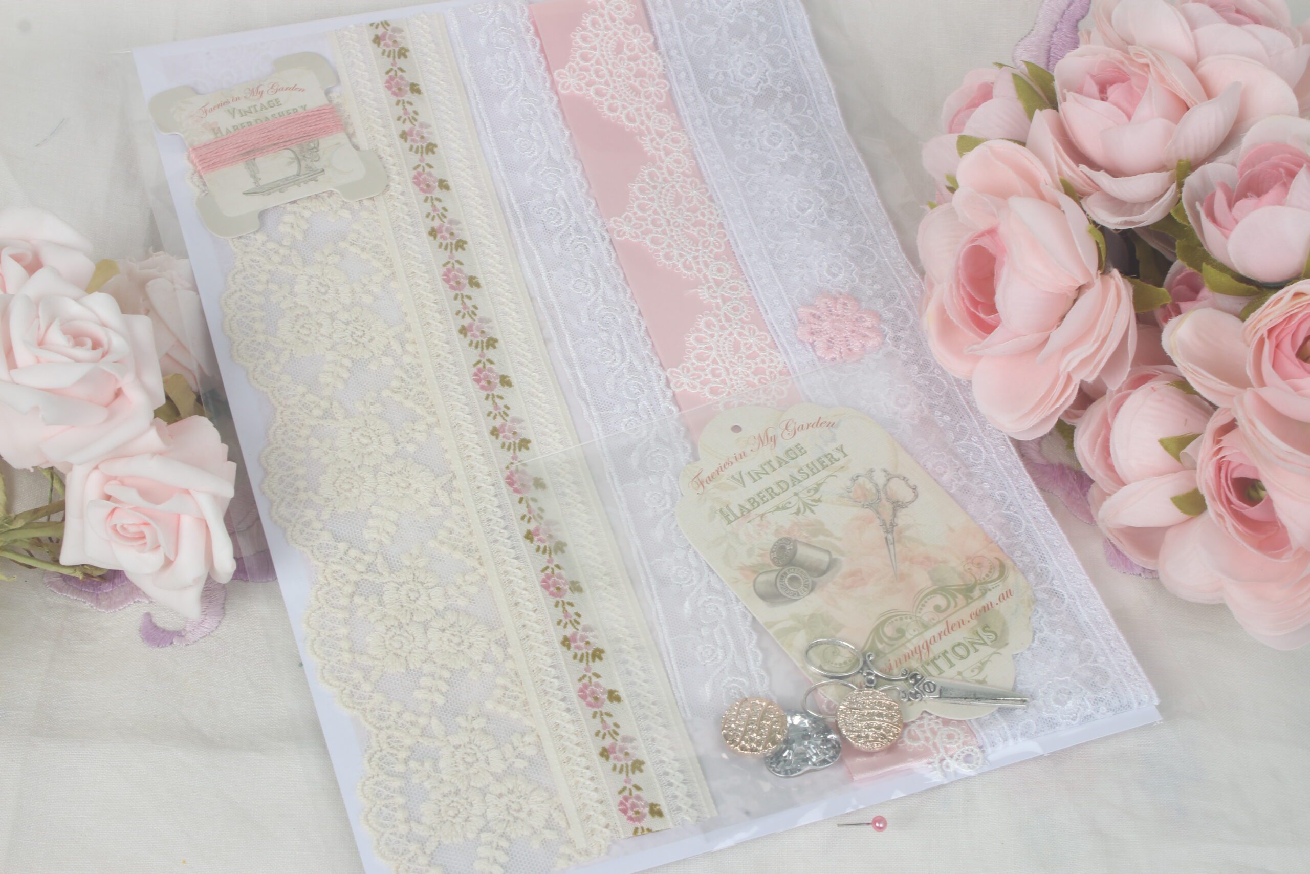 Exquisite laces, ribbons, silk ribbons, embroidered ribbons, vintage buttons, braids, all packed into delicious treasure packs. We have only six of the “Phoebe” pack available.