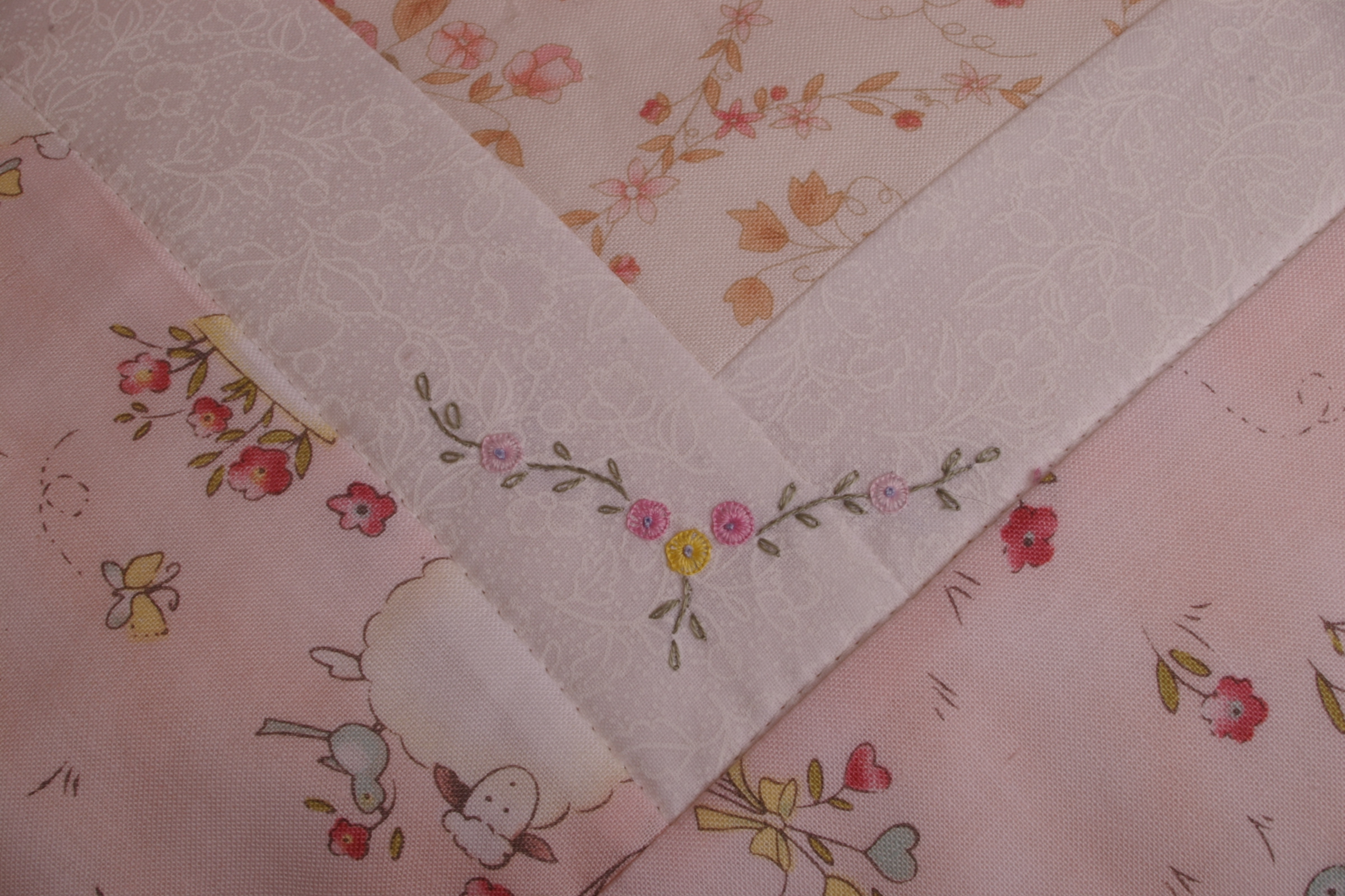 This simple little cot quilt is made from squares of coordinating print fabrics and features a lovely little inner border with a sprinkling of simple embroidery.