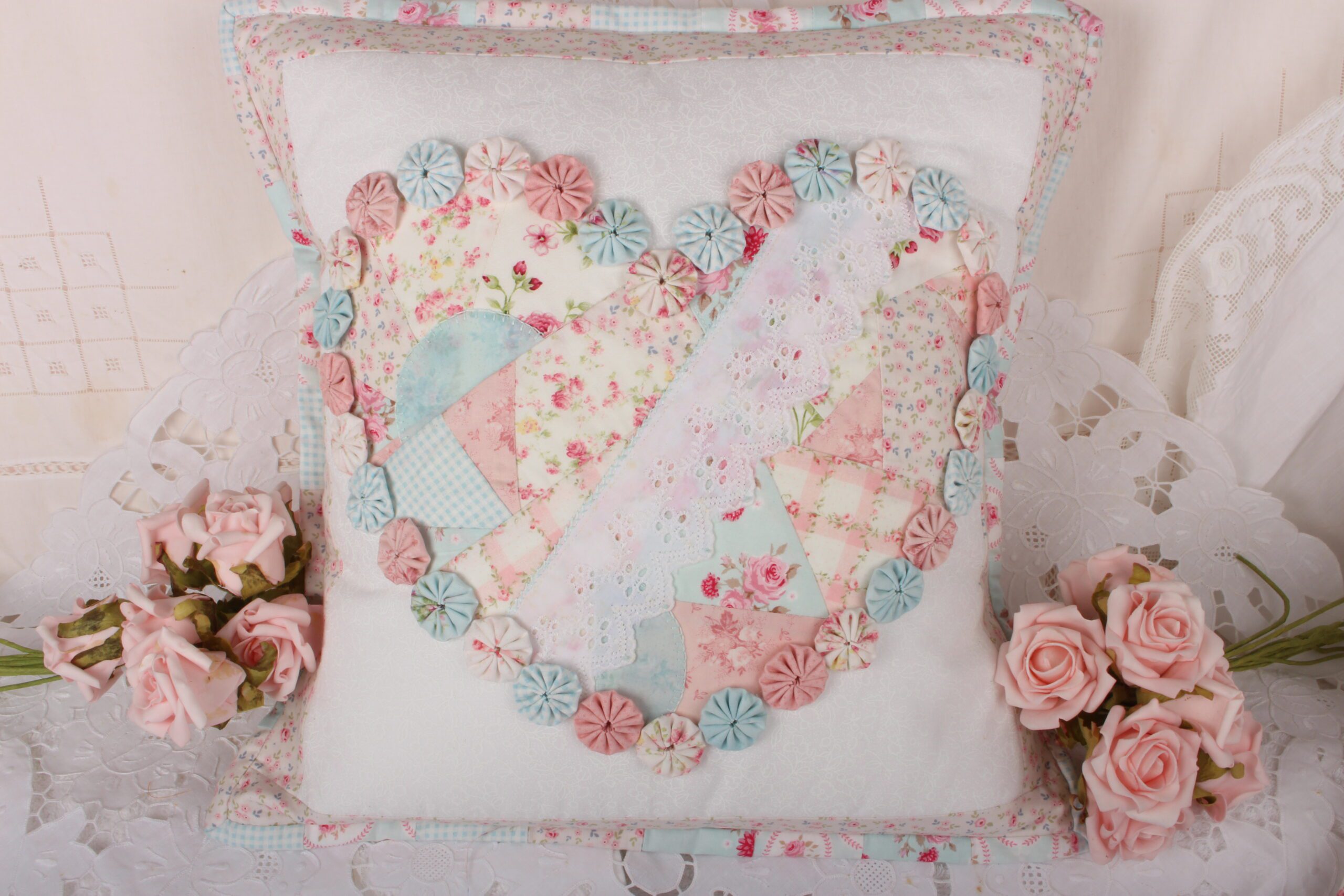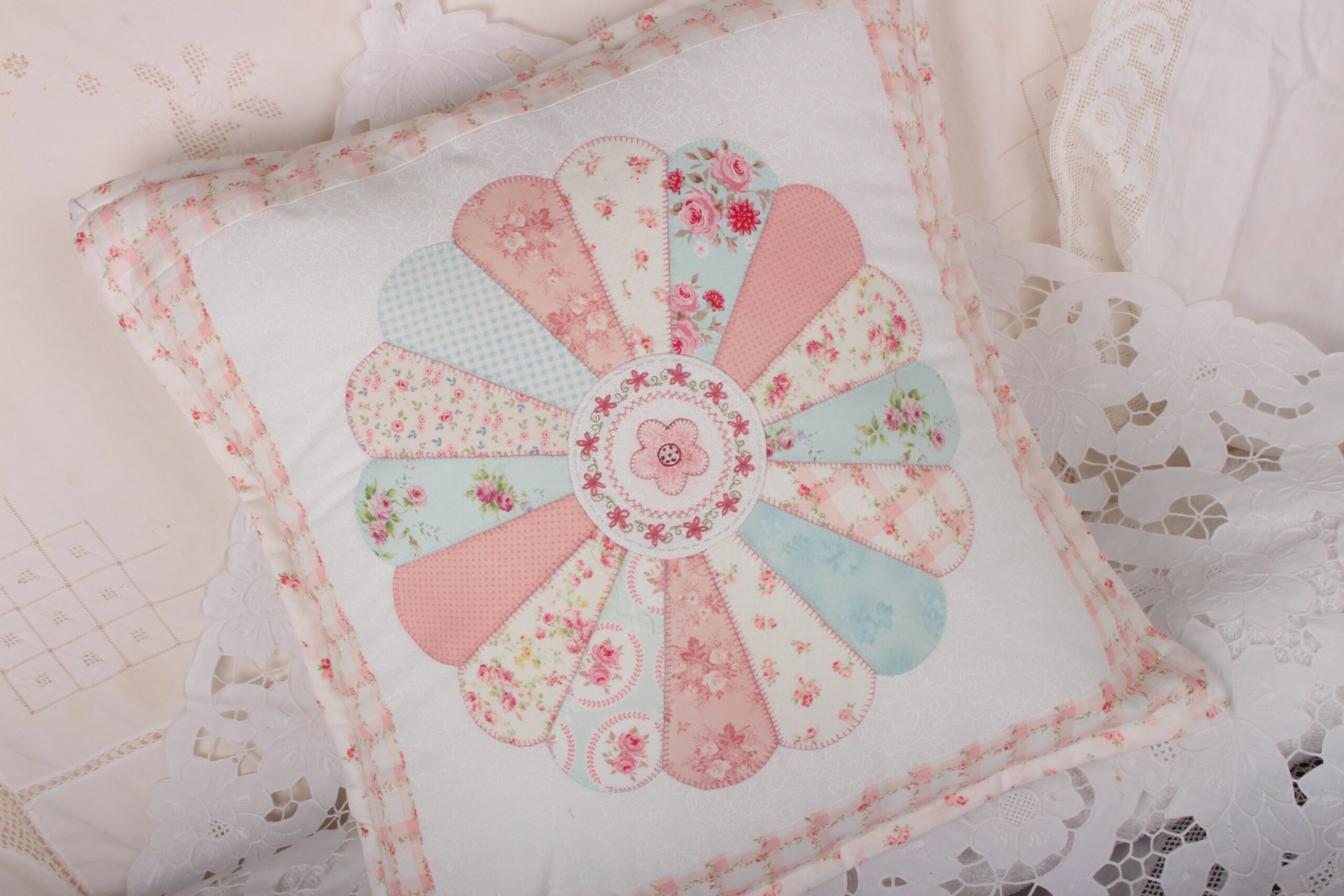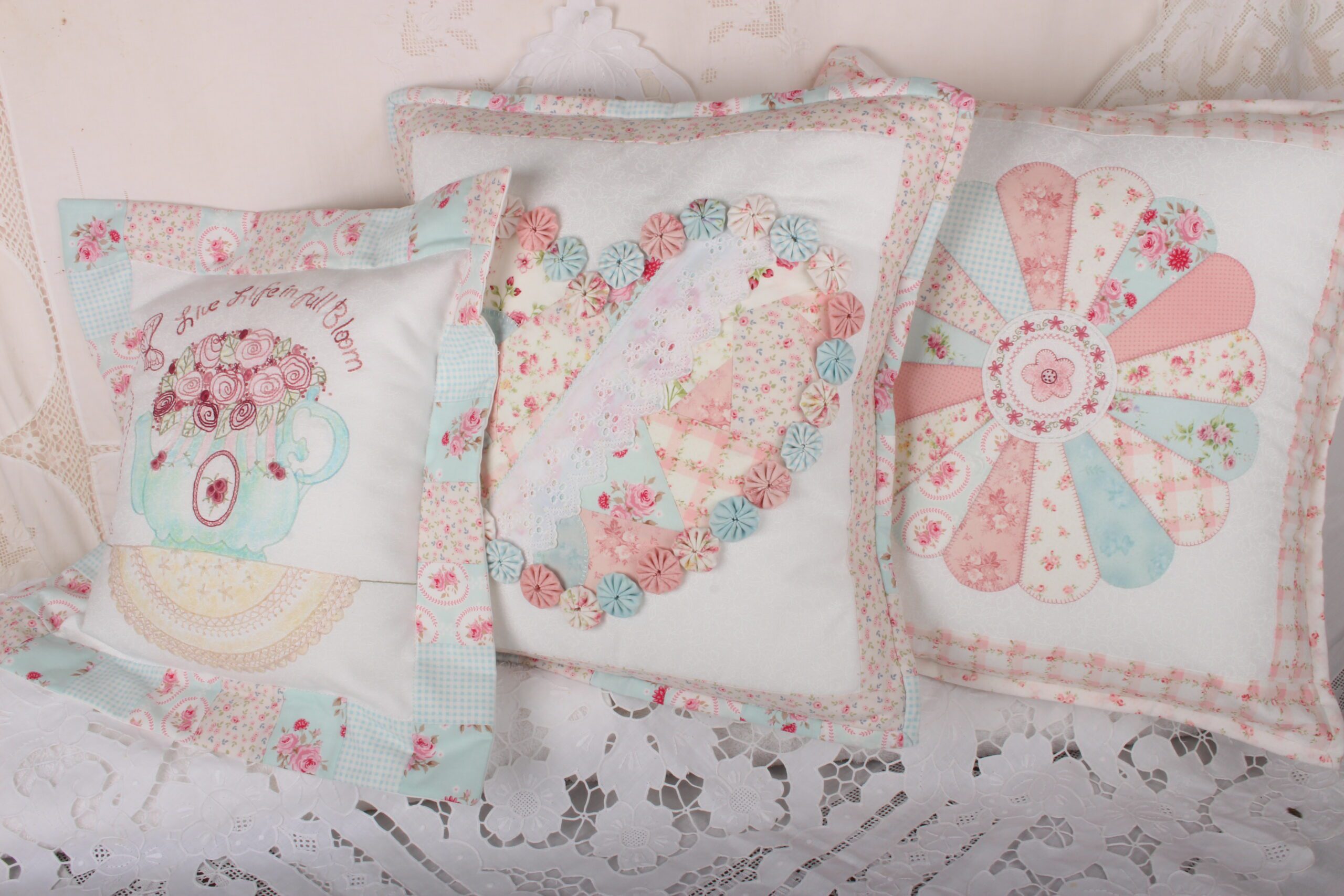 Crazy Patch Heart & Dresden Plate Cushions both 17” square; Full Bloom Cushion 16” square
