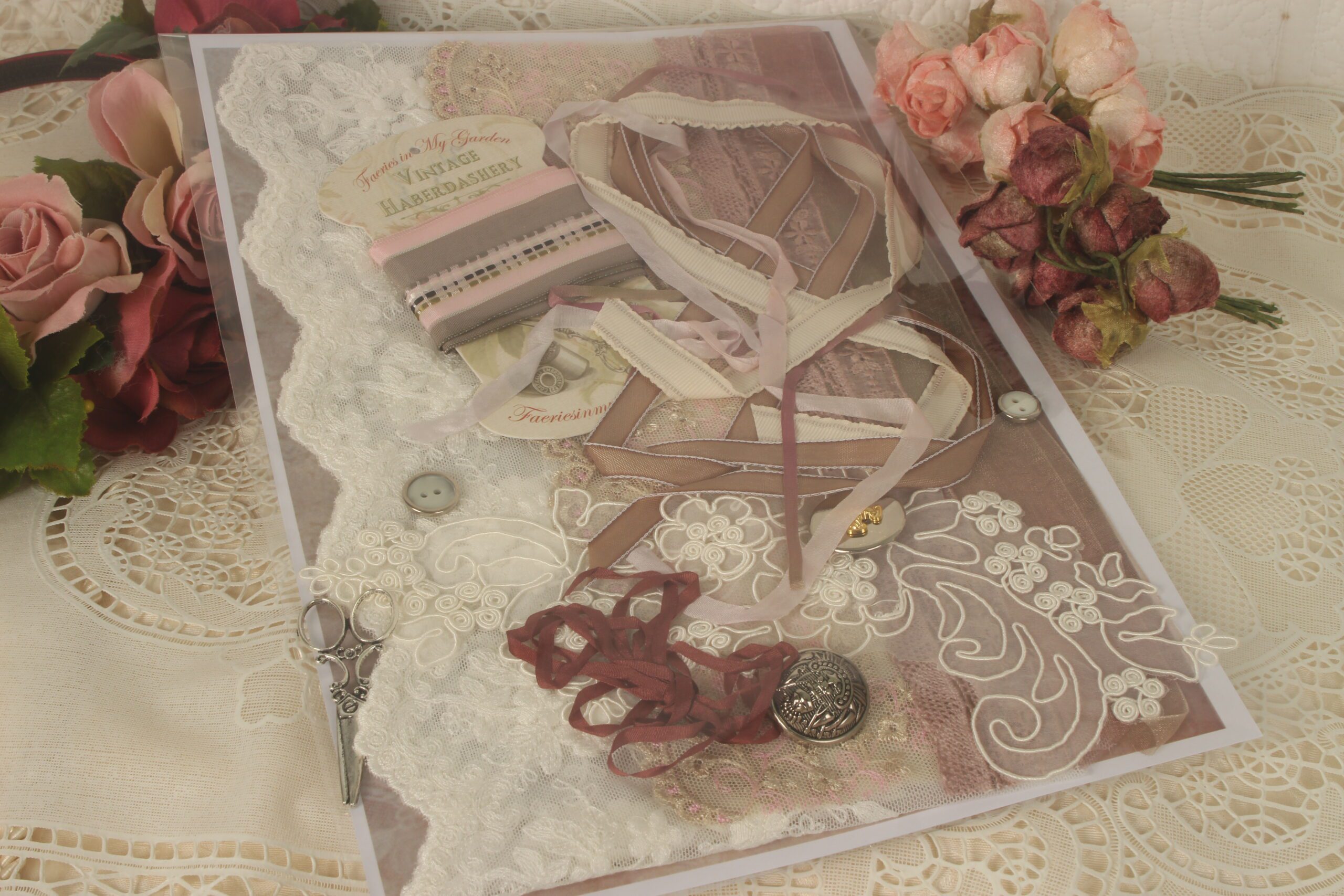 Exquisite laces, ribbons, silk ribbons, vintage buttons, braids, all packed into delicious treasure packs. We have only six of the “Dianne” pack available.