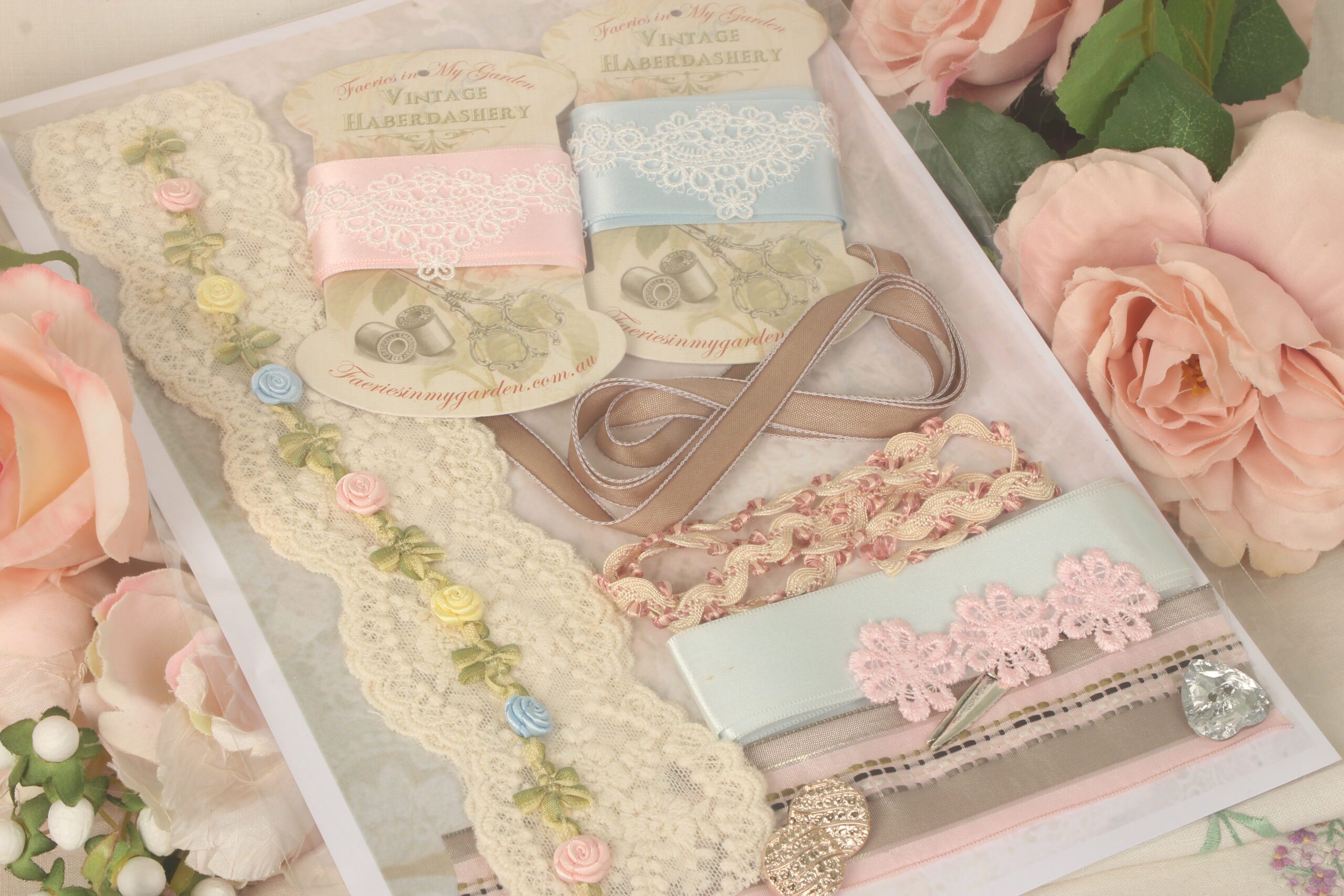 Exquisite laces, ribbons, silk ribbons, vintage buttons, braids, all packed into delicious treasure packs. We have only six of the “Hyacinth” pack available.