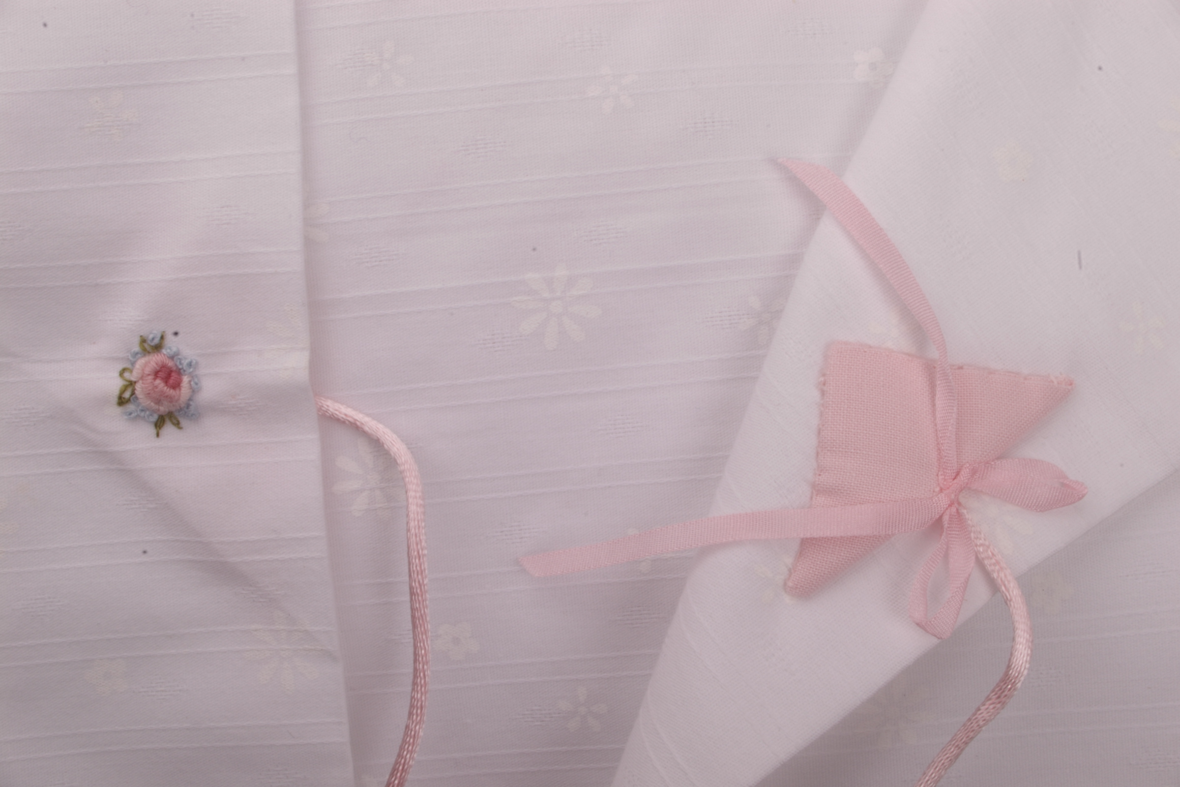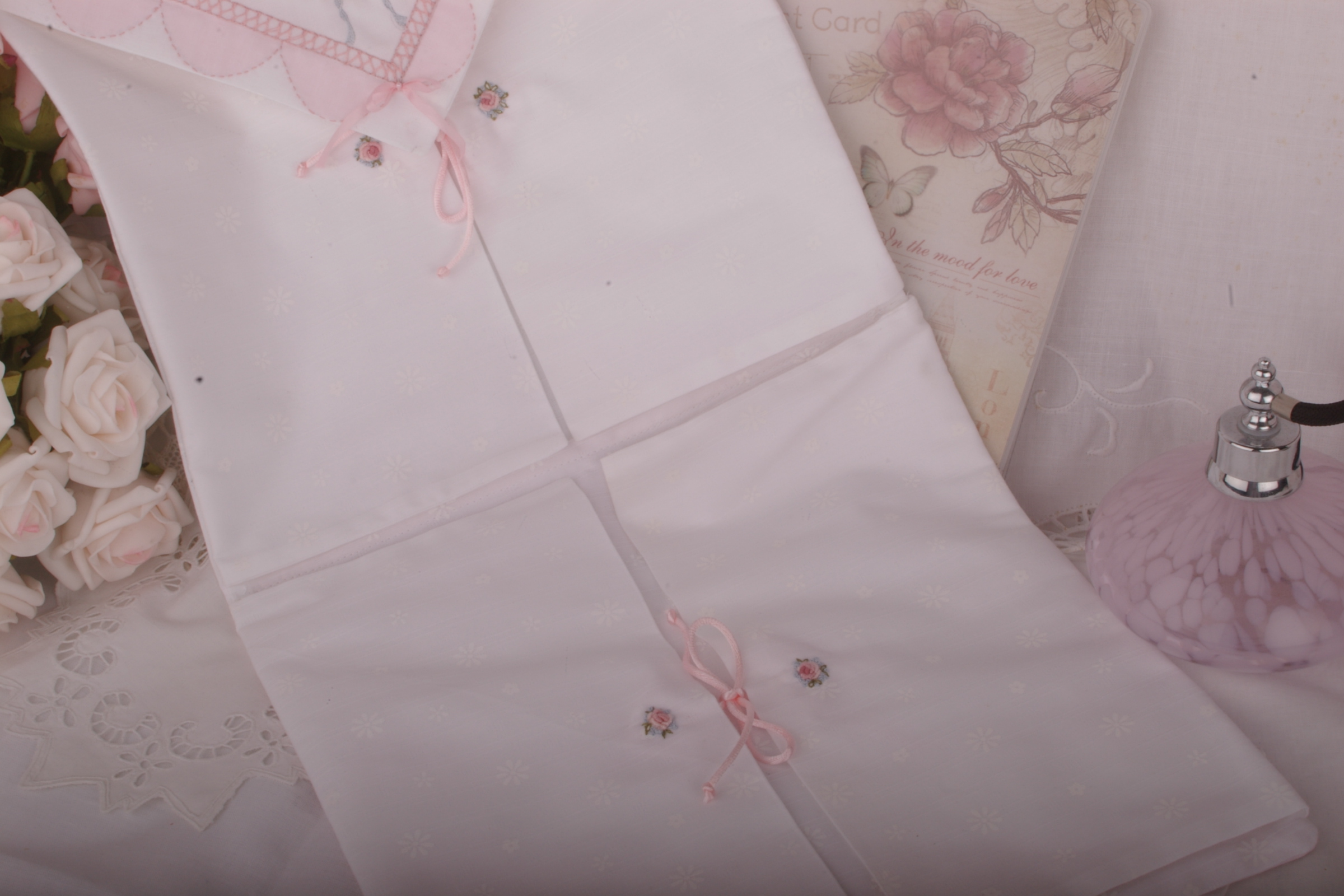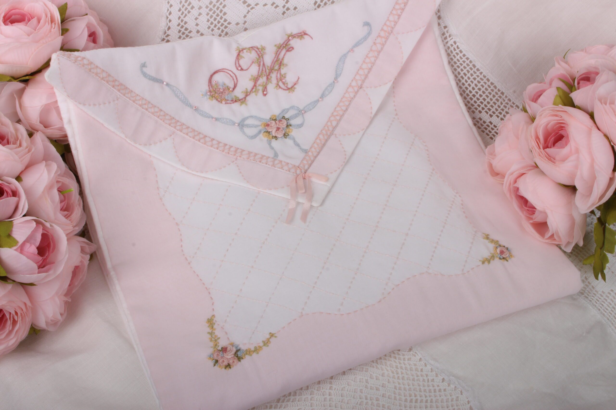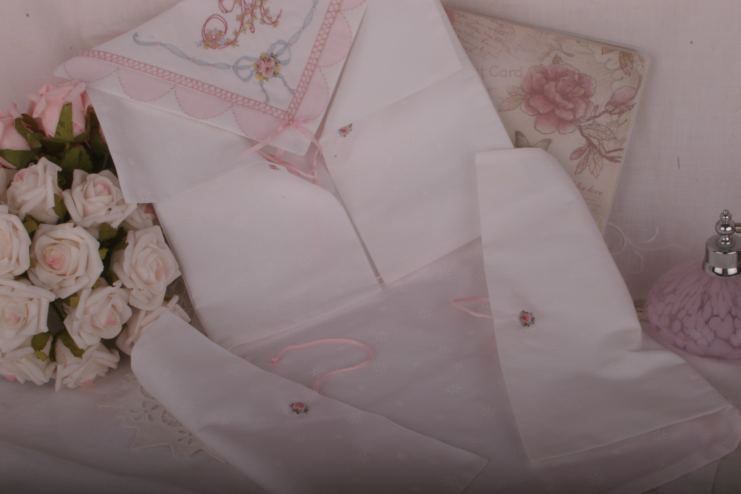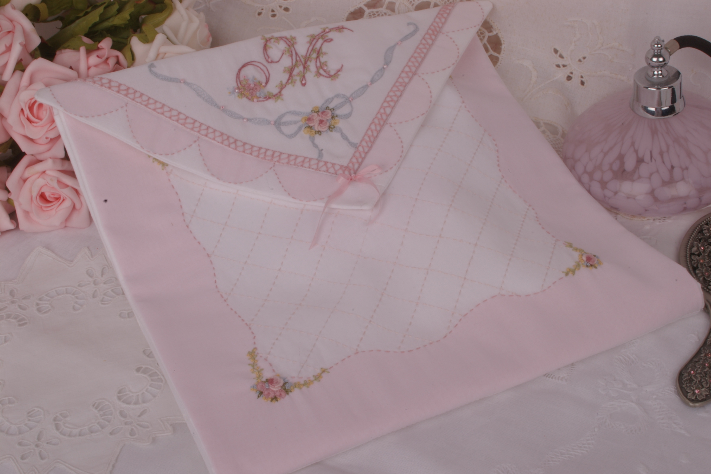 Exquisite Sachet for storage of embroidery in process, embroidery threads, heirloom handkerchiefs, fine doilies, or other pretty feminine bits and pieces.
